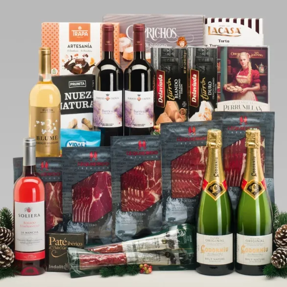 Lote de Navidad clásico y delicioso, que combina productos de diferentes regiones como cavas, vinos, embutidos ibéricos de bellota y cinco loncheados de paleta ibérica de cebo de Salamanca, surtido tradicional de turrones, bombones y dulces navideños entre otros productos que completan este estupendo regalo.