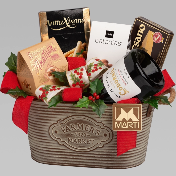 Cesto navideño metálico que incluye una botella de cava, turrón, delicias de almendra cubiertas de chocolate catanias y estuche de barquillos rellenos de turrón. Una bonita presentación para un detalle navideño muy dulce.