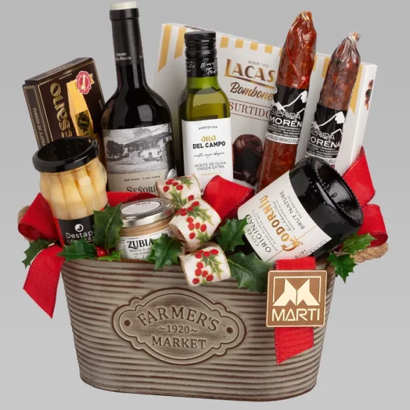 Delicioso detalle presentado en un bonito cesto navideño metálico que incluye embutidos ibéricos de bellota, mousse de foie, espárragos, turrón, bombones, aceite de oliva virgen extra, cava Brut y vino Rioja tinto Reserva.