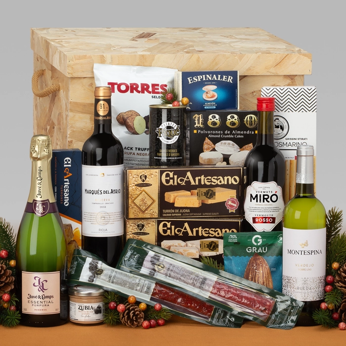 Baúl de madera que incluye en su interior embutidos ibéricos de bellota, vino tinto D.O. Rioja, vino blanco D.O. Rueda, cava Brut Reserva, vermut rosso, conservas gourmet (almejón, aceitunas, mousse ...) y una selección de dulces típicos navideños entre otros.