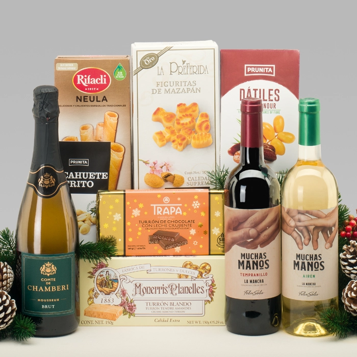 Lote de Navidad compuesto por nueve productos presentados en una caja de cartón decorada. Consta de vino tinto, vino blanco y vino espumoso, dátiles confitados, frutos secos, turrones y diferentes dulces. La magia de la Navidad al alcance de todos los bolsillos.
