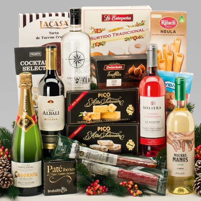 Lote de Navidad con vinos de diferentes regiones, cava y ginebra. Entre los dulces destacan los turrones (Jijona y Alicante), estuche de trufas... Se completa con embutido ibérico de bellota y paté ibérico al Pedro Ximénez con pasas entre otros. Una caja con surtido navideño a un precio increíble.