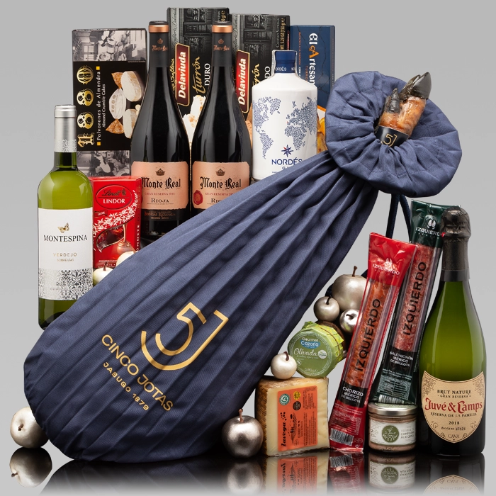 Sabores que enamoran, lotes de Navidad premium para disfrutar y compartir. La paleta Cinco Jotas 100% ibérica de bellota es la pieza protagonista en este selecto lote de Navidad. Se acompaña de vinos y cava de las mejores cosechas y marcas, ginebra, dulces tradicionales navideños, embutidos ibéricos de bellota y queso curado entre otros. Una buena elección para regalar en estas fiestas.