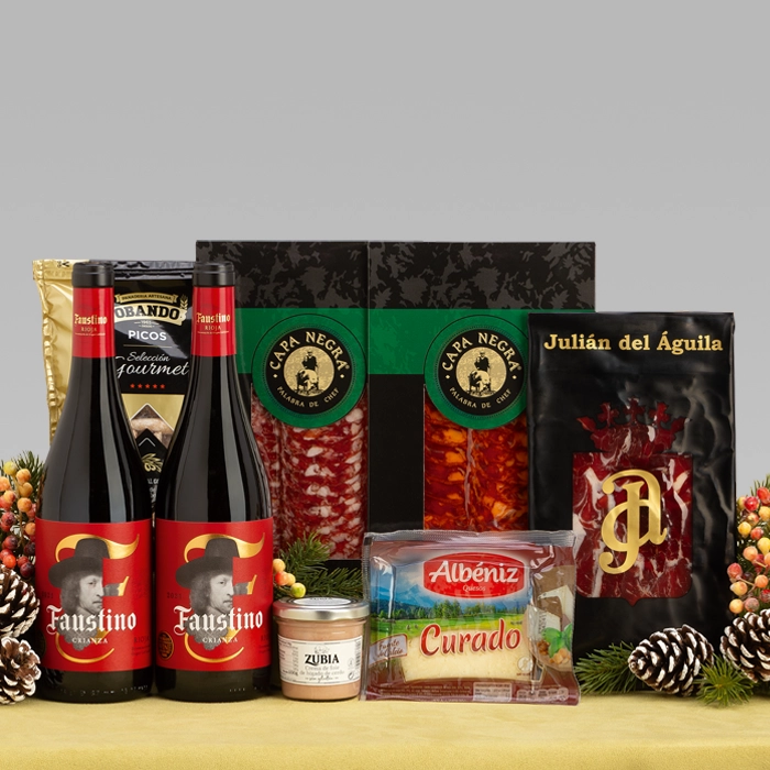 Una práctica caja con decoración navideña en la que destacan sus estuches de loncheados ibéricos, queso curado y para acompañar dichos ibéricos unos picos gourmet, crema de foie y dos botellas de excelente vino tinto Crianza de La Rioja.