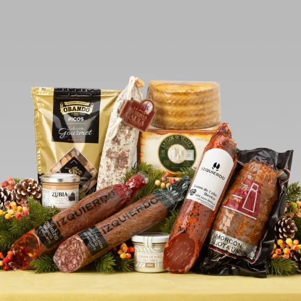 Los productos que contiene esta caja navideña incluyen excelentes embutidos ibéricos, artesanos y de bellota (morcón de lomo, salchichones, chorizo y lomo), así como una pieza de queso curado y otros productos gourmet que completan el lote. Los lotes de Navidad con embutidos son una opción ideal para los amantes de los productos cárnicos.