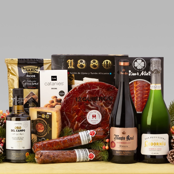 Lote de Navidad decorado para esta selección de productos de primeras marcas: embutidos 100% ibéricos y de bellota, queso curado de oveja, vino de Rioja Gran Reserva y cava Reserva, junto con aceite de oliva virgen extra, picos rústicos y dulces típicos navideños para completar este obsequio.