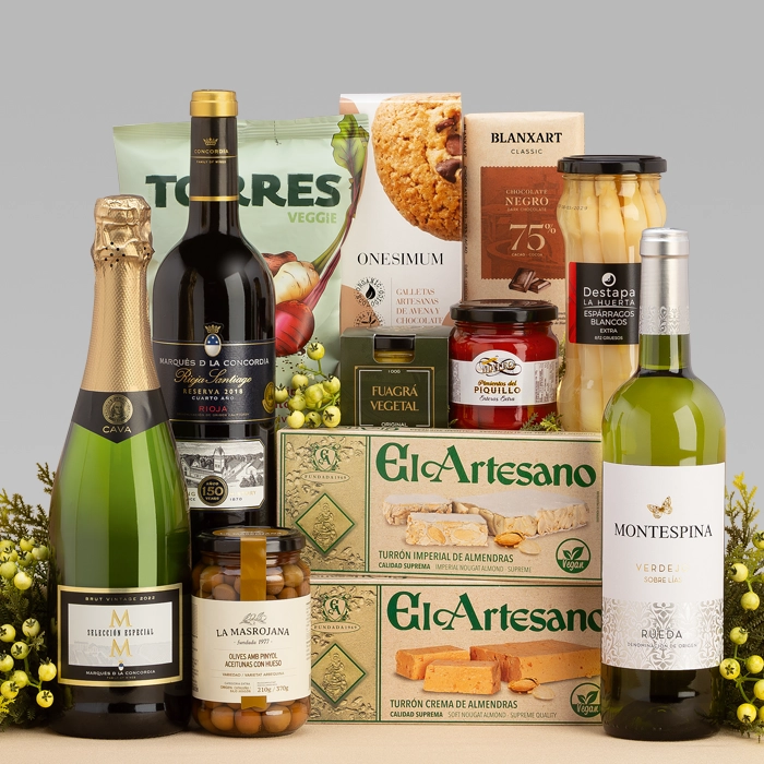 Lote de Navidad indicado para consumidores VEGANOS. Incluye un cava, vino blanco y tinto, junto con turrones de almendra, chocolate negro, galletas, una variedad de conservas y como producto novedoso Fuagrá Vegetal (producto vegano equivalente a un Foie de Oca). Estos lotes están diseñados para ofrecer una variedad de delicias festivas que pueden ser disfrutadas por todos, independientemente de sus preferencias dietéticas.