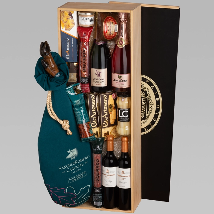 Regala una experiencia única con esta elegante caja de madera, que incluye una exquisita paleta Sánchez Romero Carvajal y una selección de productos gourmet para disfrutar durante las fiestas. Se completa con dos botellas Marqués de Murrieta y otras dos de la casa Juvé & Camps.