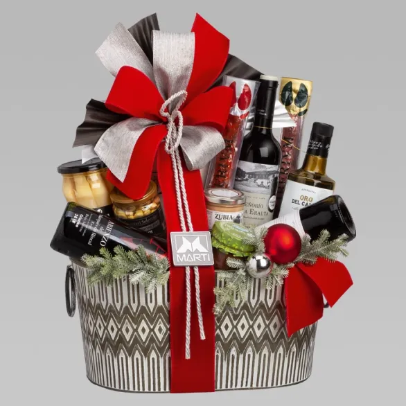 Celebra la magia de la Navidad con nuestras exclusivas cestas gourmet decoradas con mucho mimo. Destaca por sus conservas delicatessen, A.O.V.E. y embutidos ibéricos que maridan a la perfección con tres botellas de Rioja. Un regalo inolvidable.