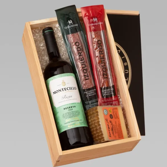 Una combinación que nunca falla es esta caja de madera con dos piezas de embutido ibérico de bellota, queso curado y un Rioja Montecillo Reserva, que hacen de este estuche navideño un regalo perfecto para deleitar.
