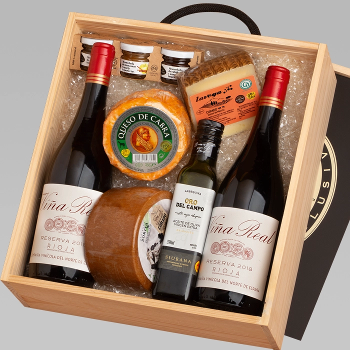 Un regalo ideal para los más "queseros", este surtido de tres quesos de oveja y de cabra, con un maridaje de tres tipos de mermelada y A.O.V.E., acompañados de dos botellas Rioja Cune Viña Real Reserva, hacen de este regalo una experiencia gourmet.