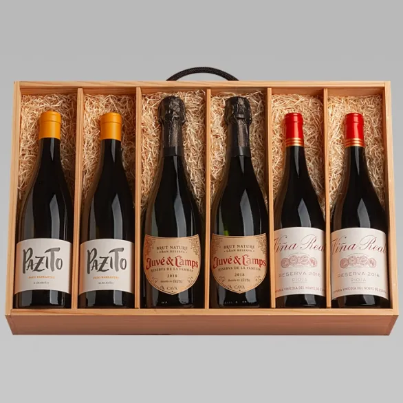 Caja de madera con dos vinos tintos Cune Viña Real Reserva, dos vinos D.O. Albariño Pazito y dos cavas de la casaJuvé & Camps. La combinación perfecta para estas fiestas navideñas.