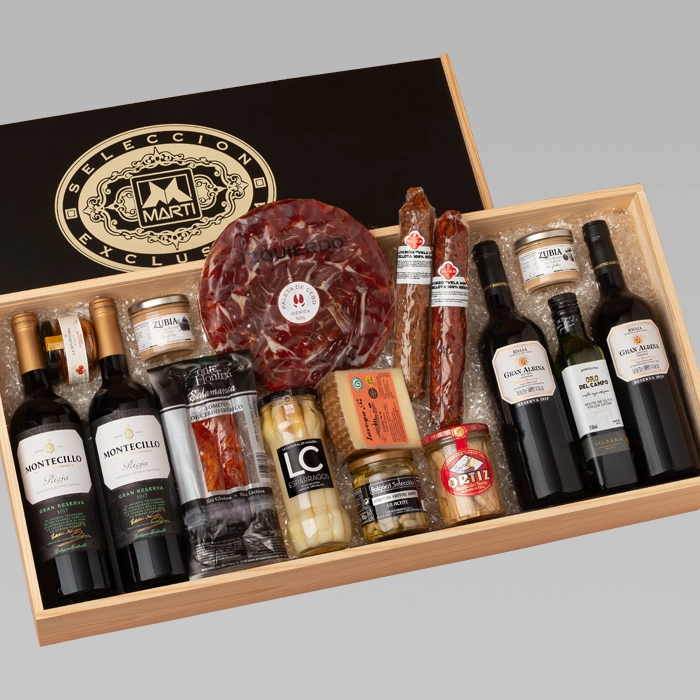 Una completa caja de madera con una selección de embutidos ibéricos, conservas gourmet, queso curado y aceite de oliva virgen extra. Un excelente surtido gastronómico acompañado por cuatro vinos tintos: dos Riojas Gran Albina Reserva y dos Riojas Montecillo Gran Reserva. Descubre la alegría de regalar.