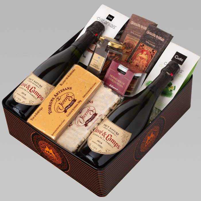 Brinda por los buenos momentos con estas dos botellas de Juvé & Camps. Este obsequio se completa con dos cajas de catanias, dos turrones artesanos Vicens de Jijona y Alicante, chocolates Amatller, mermelada y nueces acarameladas, todo ello en un bonito estuche metálico. Un dulce detalle para las fiestas navideñas.