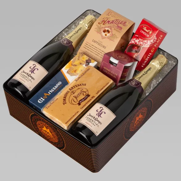 Espectacular estuche metálico con dos botellas de cava Juvé & Camps Essential Brut Reserva y un surtido de dulces navideños de excelentes marcas: turrones artesanos, bombones, flores de cappuccino. Una excelente opción para regalar y endulzar estas fiestas.