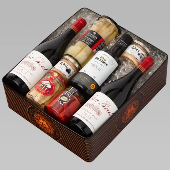 Celebra la Navidad con el mejor sabor de nuestros excelentes productos: Aceite de oliva virgen extra, bonito del Cantábrico, pimientos del piquillo y mousse de foie de pato con boletus entre otras conservas gourmet, acompañadas de dos botellas de Rioja Cune Viña Real Reserva, que hacen de este estuche metálico, el obsequio perfecto para disfrutar y compartir en estas fiestas.