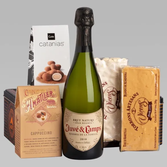 Estuche metálico con una botella de cava Juvé & Camps Reserva de la familia, perfecto acompañamiento de los turrones artesanos de la casa Vicens, flores de cappuccino Amatller y las catanias que componen este obsequio navideño.