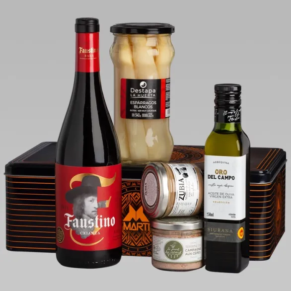 Una botella de vino tinto Rioja Faustino, aceite de oliva virgen extra, terrine Campagne aux Cèpes, espárragos y mousse de foie de pato con boletus. Un estuche metálico perfecto para tener un bonito detalle navideño.