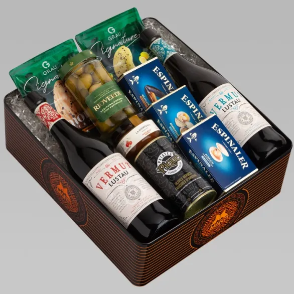 Un estuche metálico con vermut es una excelente opción de regalo para los amantes de esta bebida: Vermut rojo y blanco Lustau, incluye diferentes conservas marineras (mejillones, almejones y berberechos), paté de aceituna y otras variantes que completan la experiencia de degustación.